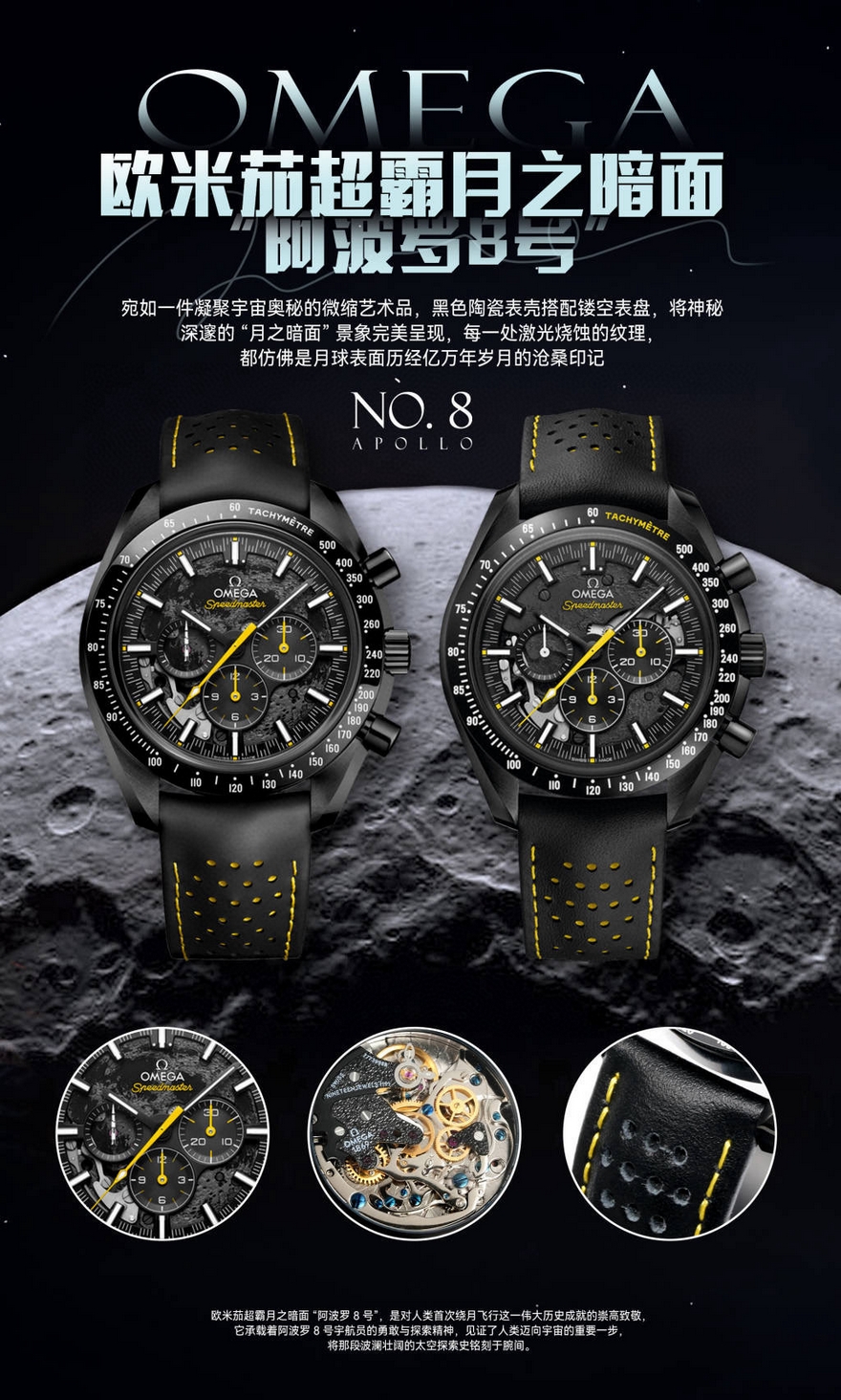 1968年阿波罗8号成功实现环月旅行,执行该任务的宇航员也因此首次看到了月球背面的景象[赞R]。为了纪念此次任务成功执行50周年,欧米茄推出阿波罗8号月之暗面超霸系列