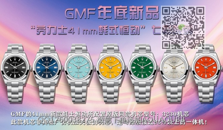 【品牌】劳力士【产品介绍】GMF年底新品“劳力仕41mm蚝士恒动”七彩系列GMF的41mm新款蚝士恒动所配置原版同款机芯型号:3230机芯,此款机芯非其他厂仿机加夹板的机芯,是与原版接近99%以上的一体机!也同样区别于其他厂家的机芯还存在三个档位的机芯,GMF的机芯与原版同步只有两个档位,尽量完美复制原版机芯的能!同样也保持真正的“904钢材”,实乃诚信所为【款式】男款【尺寸】直径41mm【表带】904L精钢表带【镜面】蓝宝石镜面【机芯】3230一体机【防水】100米防水【配件】原装盒,说明书,质保卡,吊牌,香港机打发票【品质检测】保证所有手表实物拍摄,所见即所得 , 手表发货前都会有严格检查测试,确保您收到的手表无质量问题
