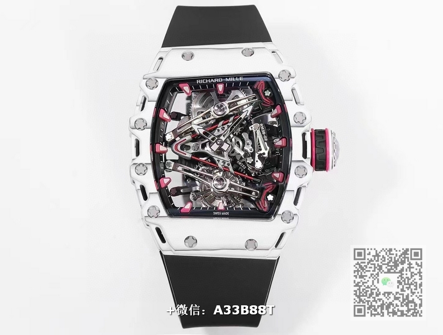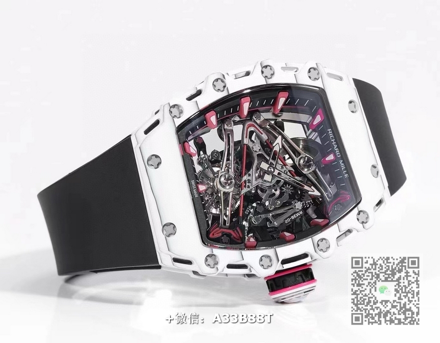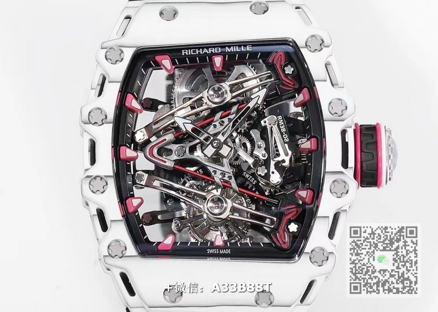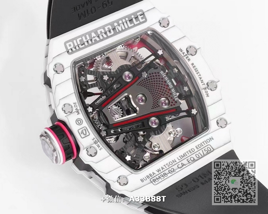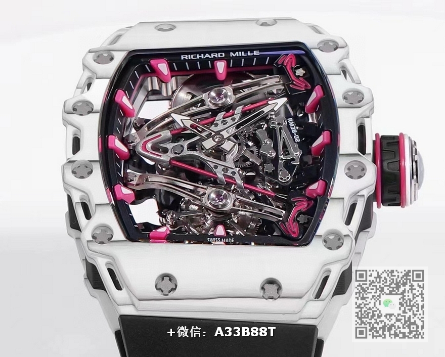 【品牌】理查德米勒【产品介绍】新表RICHARD MILLE 理查米尔 推出 RM 38-02 Tourbillon Bubba Watson 粉色主题镂空陀飞轮腕表:高尔夫球灵感风格醒目的新作——「RM 38-02 Tourbillon Bubba Watson」陀飞轮腕表与高尔夫职业球手 Bubba Watson 合作设计,独特的粉红色来自这位高尔夫名将钟爱的 PING 一号球杆,风格尤为明快,让人心生愉悦。新作表圈和底盖采用粉色和白色石英碳纤维复合材料加工而成,中层表壳则以碳纤维和粉色石英碳纤维制成,每一个表壳都有独一无二的交错纹理。梯桶形表壳能够更舒适紧密的贴合手腕,表冠顶部巧妙模仿高尔夫球的凹凸造型,是颇为有趣的细节。全开放式表盘让佩戴者清晰欣赏机芯的完整运转,镂空桥板在表盘中勾勒出横向的「V」字形,粉色手绘图案则来自 Bubba Watson 使用的球杆杆头。6点陀飞轮结构能够承受10000g冲击力,职业球手在高速击杆时也能稳定运转。搭载 RM 38-02 手动上链机芯,摆频28800vph,提供52小时动力储备。这枚机芯采用碳纤维制作镂空底板,具备优异的防震性能。桥板依然为坚固的 5级钛金属材质,背面的小孔亦融入粉色元素装饰。【款式】男款【尺寸】43.70 x 50.04mm【表带】橡胶表带/尼龙纤维表带,两种表带类型可供选择,二选一【镜面】蓝宝石镜面【机芯】RM38-02手动陀飞轮机芯【防水】50米防水【配件】原装盒,说明书,质保卡,吊牌,香港机打发票【品质检测】保证所有手表实物拍摄,所见即所得 , 手表发货前都会有严格检查测试,确保您收到的手表无质量问题