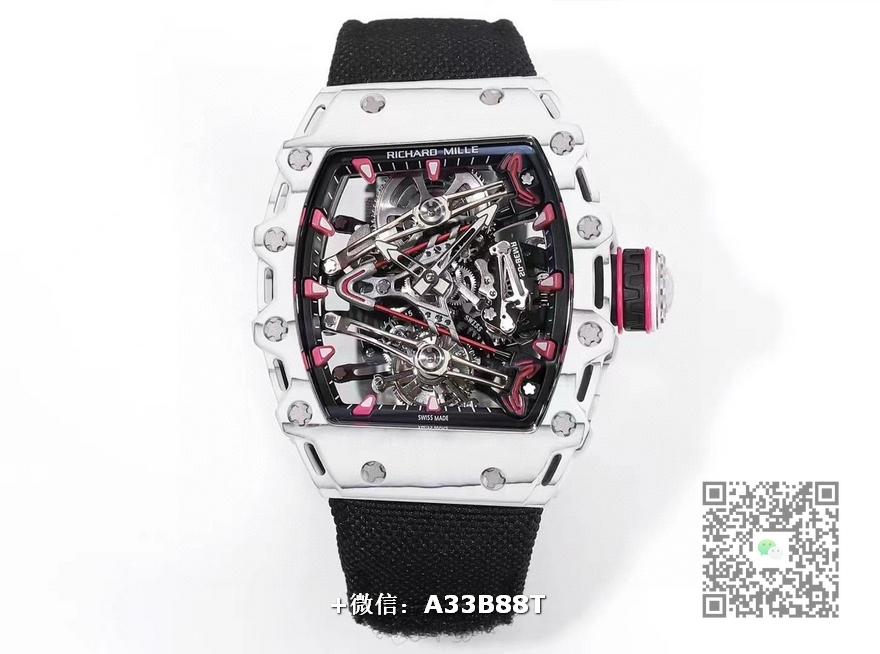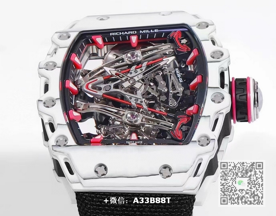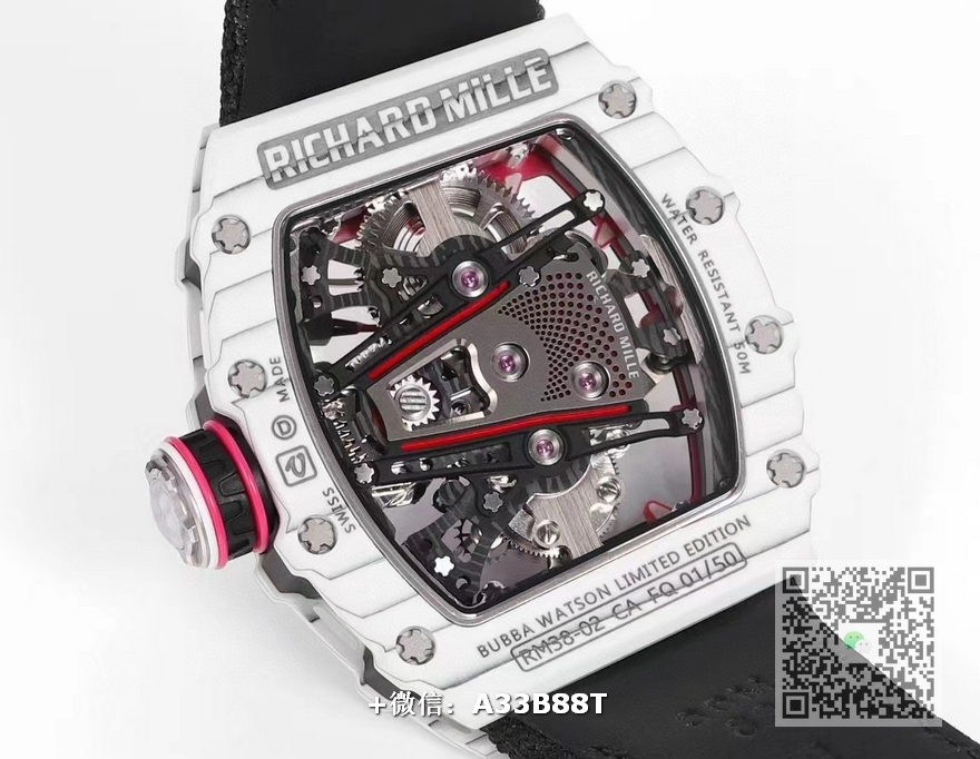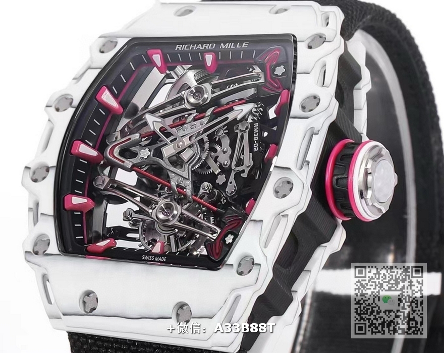【品牌】理查德米勒【产品介绍】新表RICHARD MILLE 理查米尔 推出 RM 38-02 Tourbillon Bubba Watson 粉色主题镂空陀飞轮腕表:高尔夫球灵感风格醒目的新作——「RM 38-02 Tourbillon Bubba Watson」陀飞轮腕表与高尔夫职业球手 Bubba Watson 合作设计,独特的粉红色来自这位高尔夫名将钟爱的 PING 一号球杆,风格尤为明快,让人心生愉悦。新作表圈和底盖采用粉色和白色石英碳纤维复合材料加工而成,中层表壳则以碳纤维和粉色石英碳纤维制成,每一个表壳都有独一无二的交错纹理。梯桶形表壳能够更舒适紧密的贴合手腕,表冠顶部巧妙模仿高尔夫球的凹凸造型,是颇为有趣的细节。全开放式表盘让佩戴者清晰欣赏机芯的完整运转,镂空桥板在表盘中勾勒出横向的「V」字形,粉色手绘图案则来自 Bubba Watson 使用的球杆杆头。6点陀飞轮结构能够承受10000g冲击力,职业球手在高速击杆时也能稳定运转。搭载 RM 38-02 手动上链机芯,摆频28800vph,提供52小时动力储备。这枚机芯采用碳纤维制作镂空底板,具备优异的防震性能。桥板依然为坚固的 5级钛金属材质,背面的小孔亦融入粉色元素装饰。【款式】男款【尺寸】43.70 x 50.04mm【表带】橡胶表带/尼龙纤维表带,两种表带类型可供选择,二选一【镜面】蓝宝石镜面【机芯】RM38-02手动陀飞轮机芯【防水】50米防水【配件】原装盒,说明书,质保卡,吊牌,香港机打发票【品质检测】保证所有手表实物拍摄,所见即所得 , 手表发货前都会有严格检查测试,确保您收到的手表无质量问题